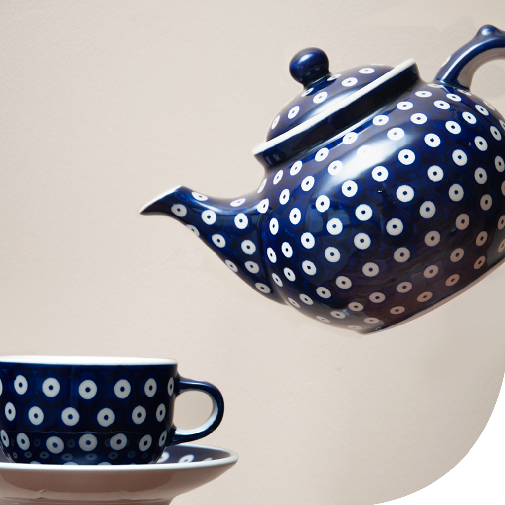 Das gepunktete Muster ist ein weiteres traditionelles und beliebtes Design der Bunzlauer Keramik. Die Kombination aus kräftigem Kobaltblau und präzise angeordneten weißen Punkte verleiht den Keramikstücken eine schlichte, aber elegante Optik. Die Punkte werden per Hand in gleichmäßigen Abständen auf die Oberfläche aufgetragen, was jedem Stück einen charmanten, handgefertigten Charakter verleiht. Das punktierte Design strahlt eine zeitlose Schlichtheit aus, die sowohl zu modernen als auch zu klassischen Tischdekorationen passt. Es ist besonders beliebt für Alltagsgeschirr und wird weltweit als Symbol für die handwerkliche Tradition und Qualität der Bunzlauer Keramik geschätzt.